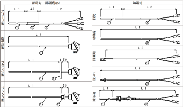 1100℃程度までの温度測定に使用され、R熱電対に比べ、安価で発起電力が高く最も工業的に大量に使用されています。