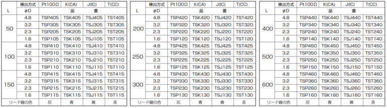 300℃以下で使用され、感度はKより若干劣りますが、精度が高く電気抵抗が低いので、比較的温度の測定には広く使用されています。